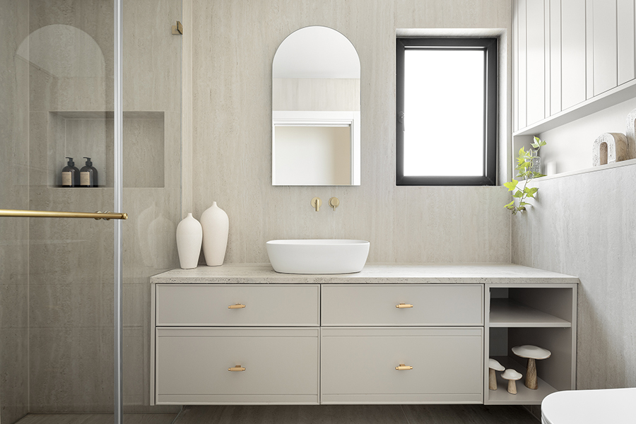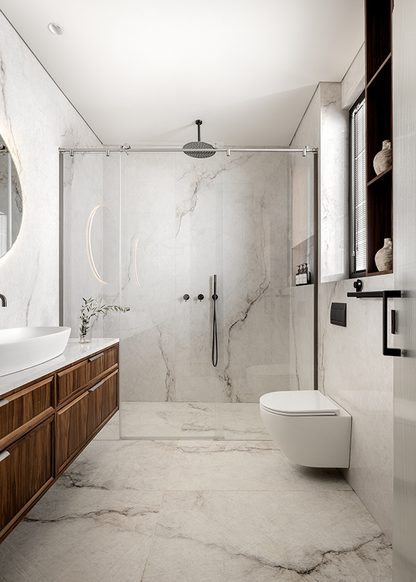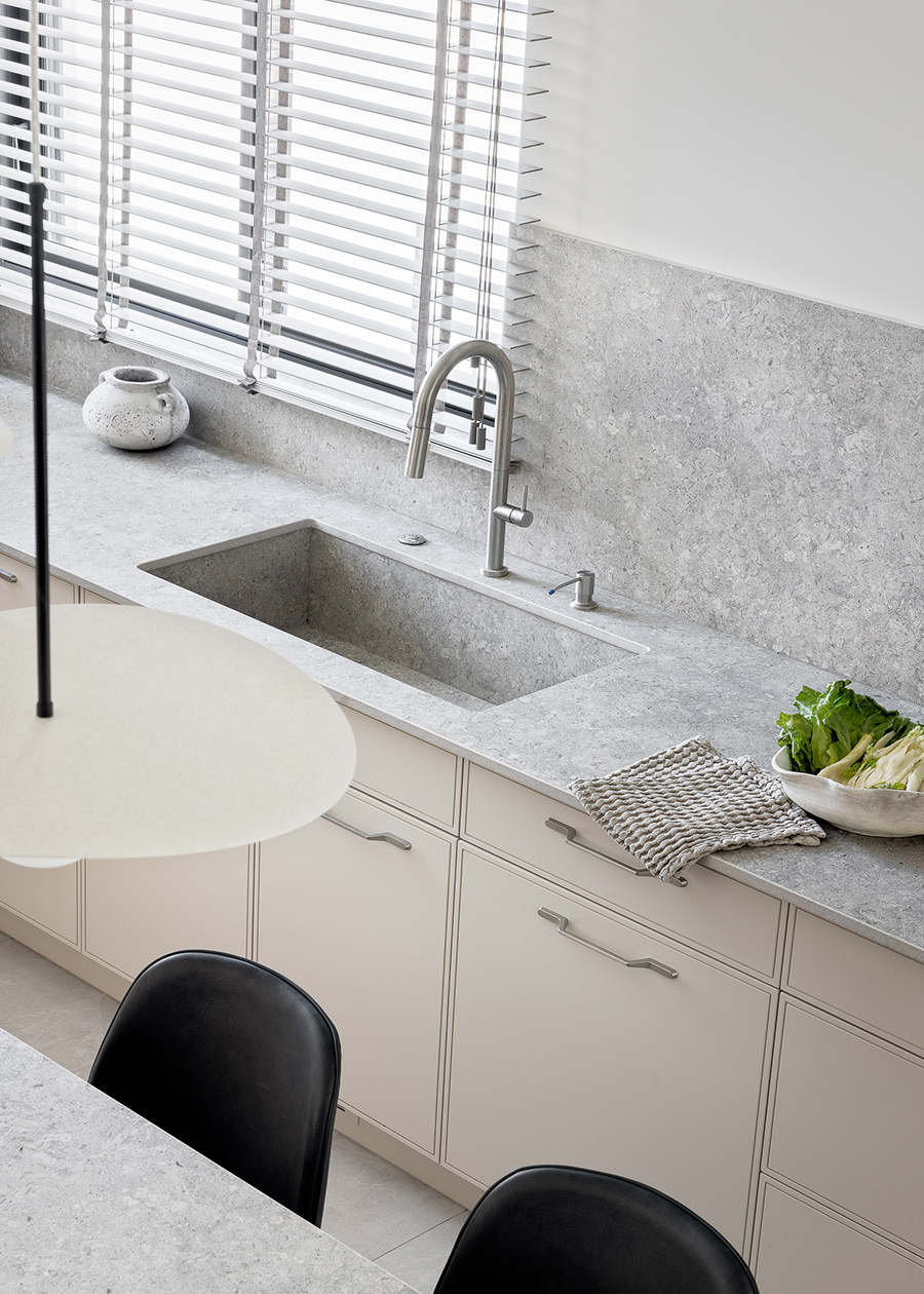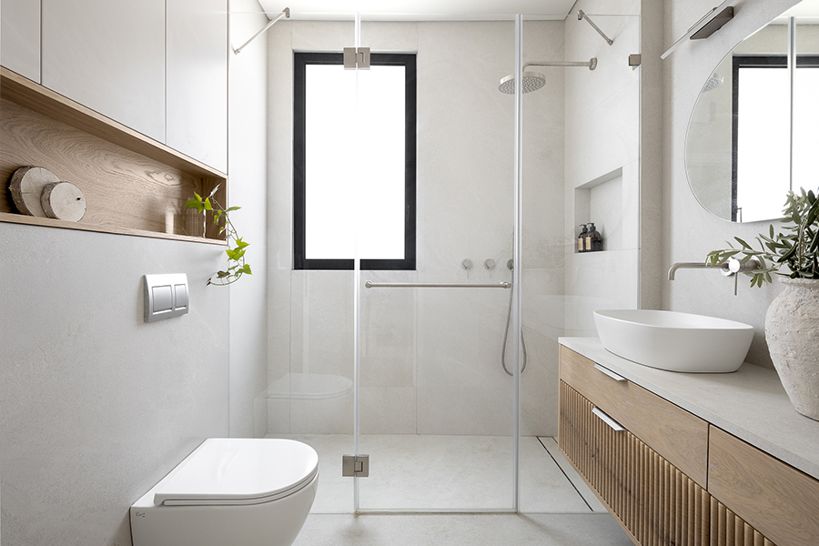הוגדר דגש מיוחד על פונקציונליות: בחירה בחומרים עמידים, צבעים רכים ושכבות אבן בגוונים טבעיים.