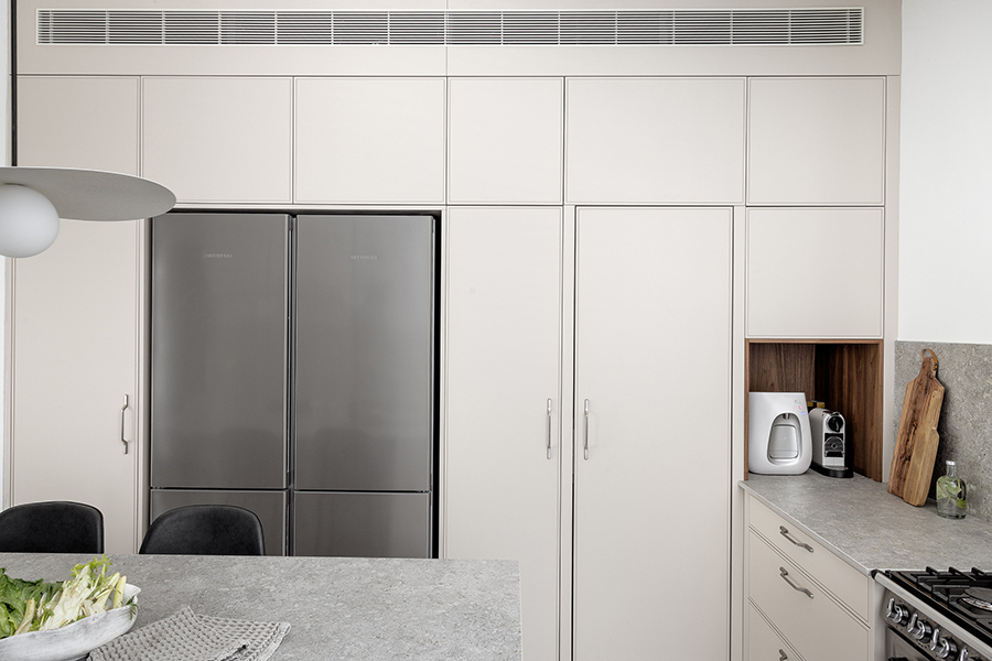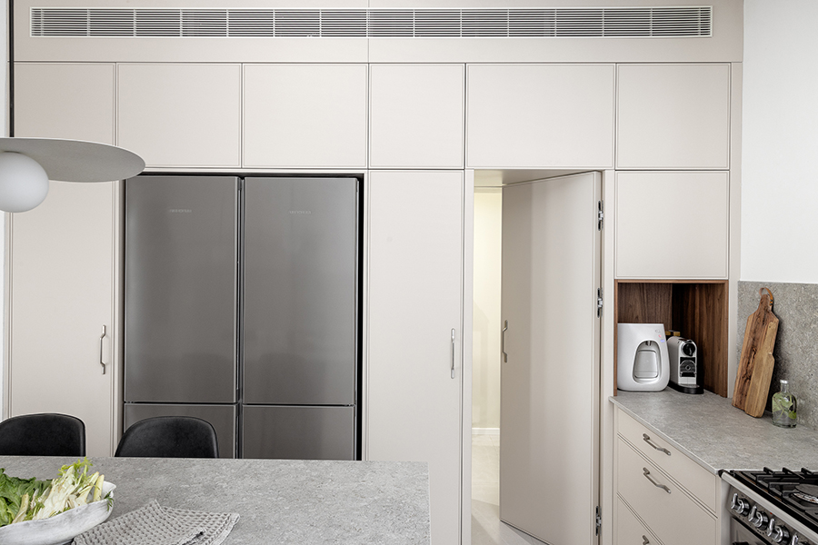 המטבח עוצב בסגנון כפרי-קלאסי, בשילוב דלת מסתור, לחדר שירות נוסף. עם אי רחב המשמש כלב הבית.