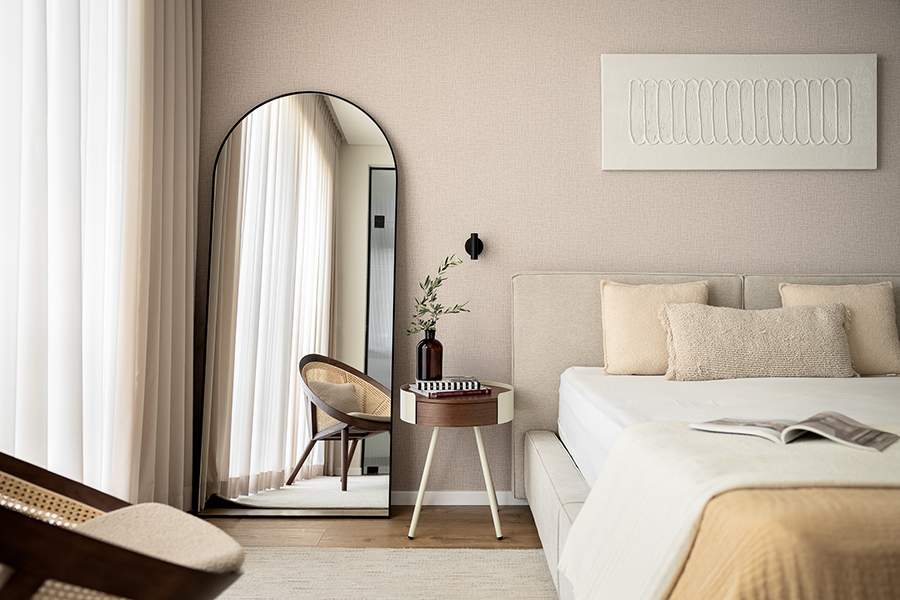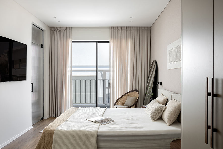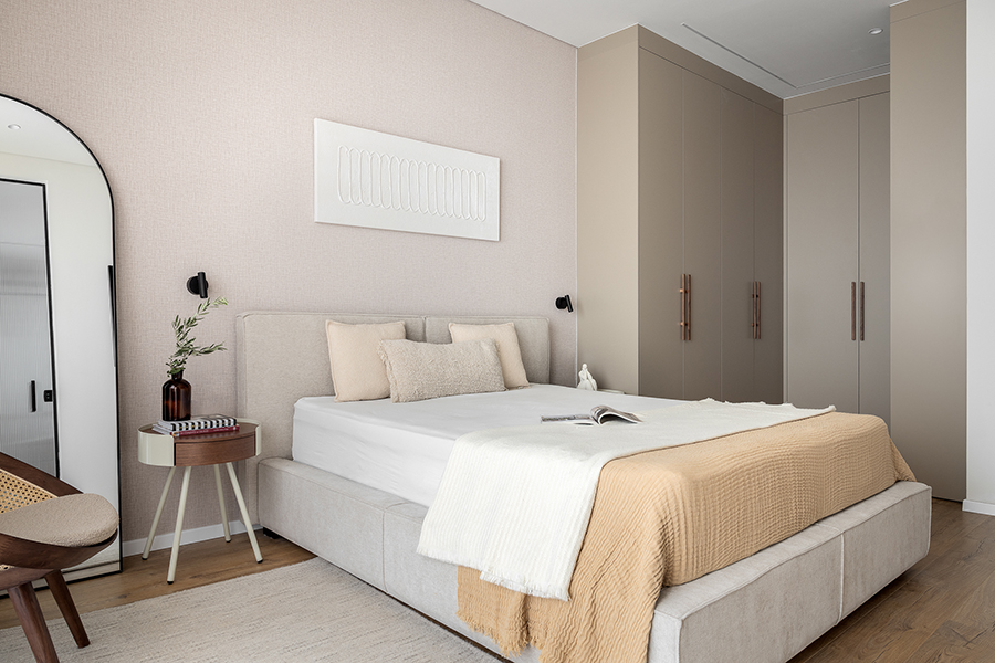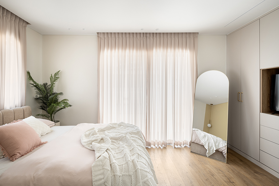חדר ההורים עוצב בקו מינימליסטי ונקי, והבית כולל גם חדר שירות מרווח ושלוש מקלחות המעוצבות באריחי פורצלן דקים